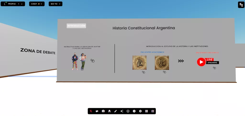 El equipo docente, integrado por el profesor Andrés Warschauer y Valentín Patzi, nos planteó la idea de dictar una cátedra completa desde el metaverso. Desde Innovalab diseñamos un espacio temático dentro de la plataforma, ajustado al contenido de la materia.