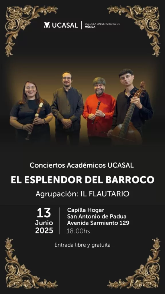 Bajo el título «El esplendor del Barroco», el concierto se realizará el viernes 13 de junio a las 18:00 hs, en la Capilla Hogar San Antonio de Padua (Av. Sarmiento 129).