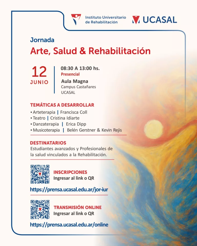 La jornada surge del compromiso del Instituto Universitario de Rehabilitación de UCASAL con una atención centrada en la persona, reconociendo la complejidad de los procesos de salud y enfermedad. En este marco, se abordarán cuatro disciplinas expresivas como herramientas complementarias para la rehabilitación integral: