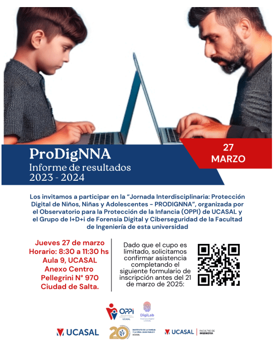 El Jueves 27 de Marzo de 2025 llevamos a cabo la Jornada Interdisciplinaria: Protección Digital de Niños, Niñas y Adolescentes – ProDigNNA, organizada por el Observatorio para la Protección de la Infancia (OPPI) del Instituto de Familia y Vida “Juan Pablo II” y el Grupo de I+D+i de Forensia Digital y Ciberseguridad de la Facultad de Ingeniería de UCASAL.