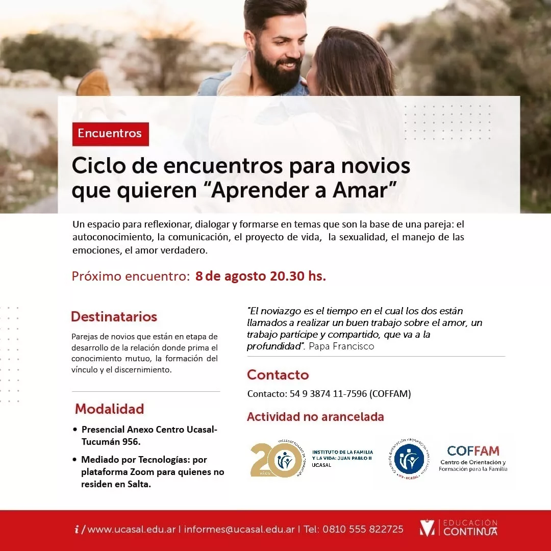 Se propone profundizar en los temas vinculados a la relación de pareja, reconociendo el noviazgo como una etapa rica en sí misma, válida para que cada uno aprenda a conocerse, conocer al otro y elaborar un proyecto en común experimentando de esta manera una iniciación específica al sacramento del matrimonio para tener una clara conciencia de sus notas esenciales.
