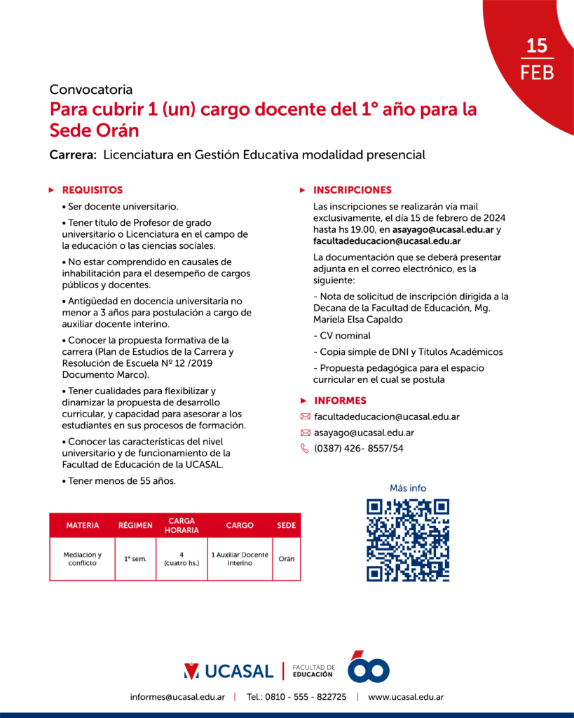 Convocatoria para cubrir 1 (un) cargo docente para el 1° Año de la carrera Licenciatura en Gestión Educativa