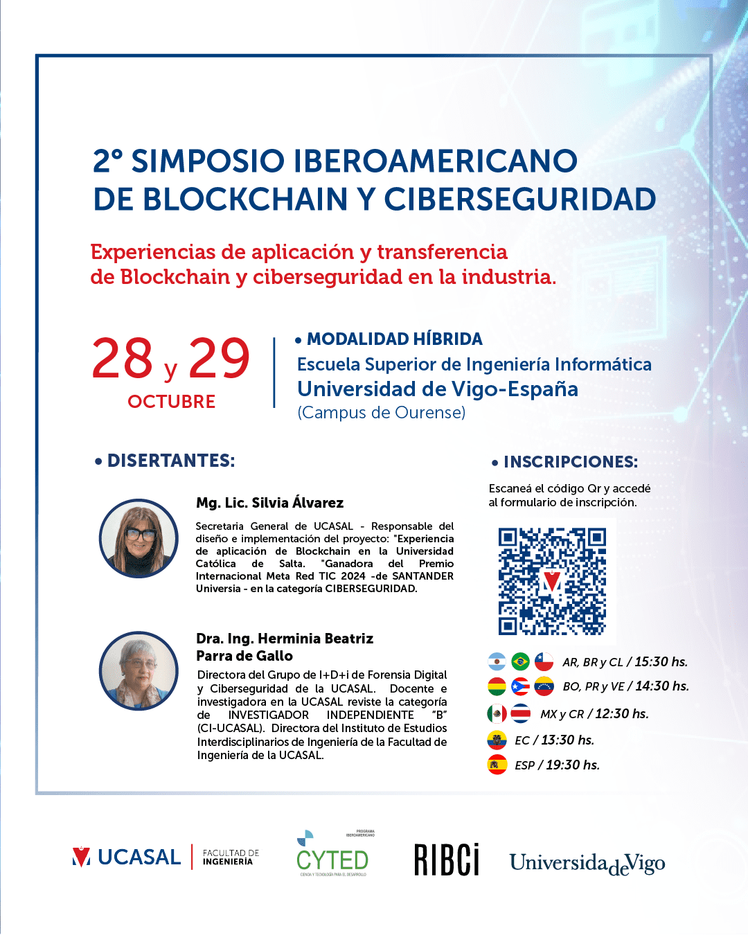 La Universidad Católica de Salta (UCASAL) se complace en anunciar su participación en el 2° Simposio Iberoamericano de Blockchain y Ciberseguridad, que se llevará a cabo los días 28 y 29 de octubre en la Universidad de Vigo, España, de manera híbrida. Un evento esencial para profesionales y académicos interesados en las tecnologías emergentes y su aplicación en el ámbito industrial.