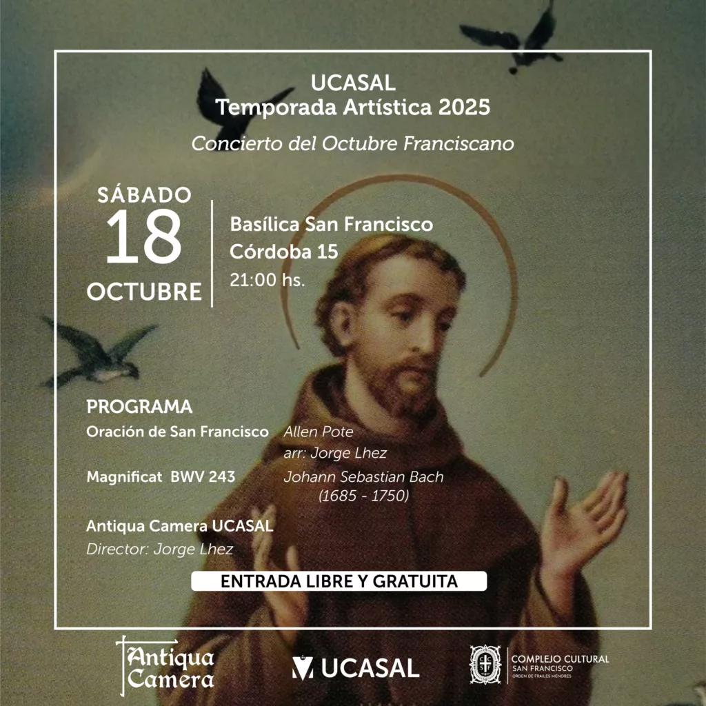 En el marco del Octubre Franciscano y en conmemoración de los 800 años del Cántico de las Criaturas, se realizará un concierto en la Basílica San Francisco de Salta, a cargo de Antiqua Camera UCASAL y solistas invitados, bajo la dirección del Maestro Jorge Lhez.