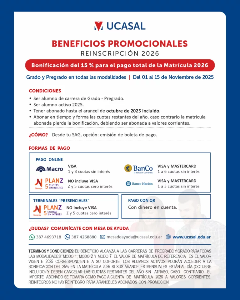 La Universidad Católica de Salta lanza una promoción especial para sus estudiantes de carreras de Grado y Pregrado, en todas las modalidades, que realicen su reinscripción al ciclo 2026 entre el 1 y el 15 de noviembre de 2025.