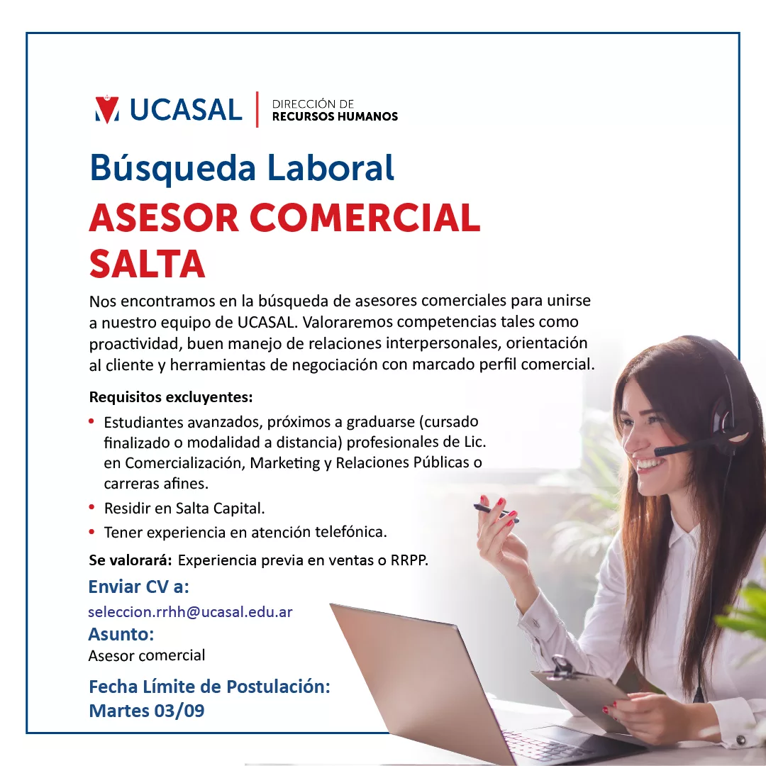 Nos encontramos en la búsqueda de asesores comerciales para unirse a nuestro equipo de UCASAL.