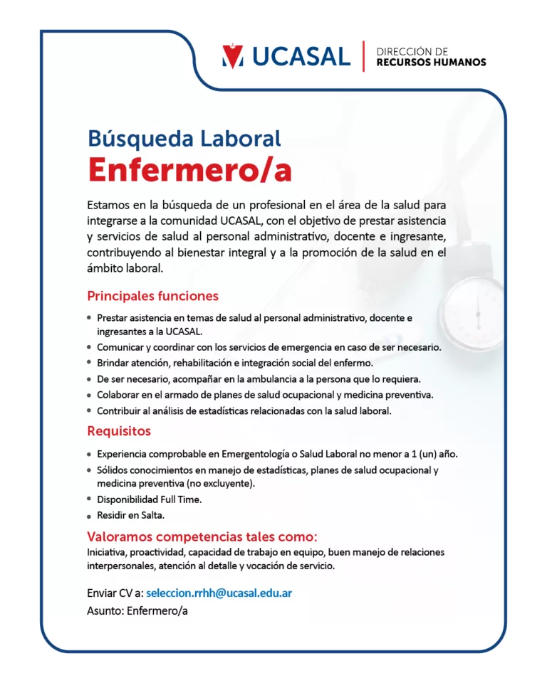 Además, se valorarán competencias como iniciativa, proactividad, capacidad de trabajo en equipo, buen manejo de relaciones interpersonales, atención al detalle y vocación de servicio. Quienes deseen postularse deberán enviar su CV a seleccion.rrhh@ucasal.edu.ar, indicando en el asunto: Enfermero/a.
