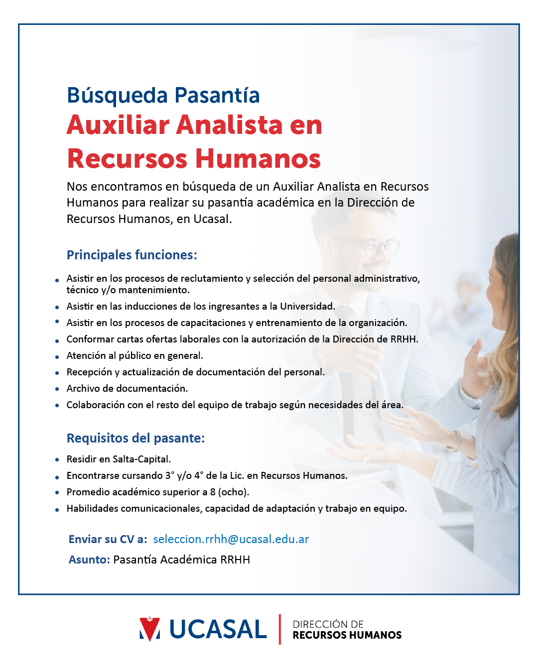 Nos encontramos en la búsqueda de un estudiante de los últimos años de la Licenciatura en RRHH para desempeñarse en la Dirección de Recursos Humanos de UCASAL.