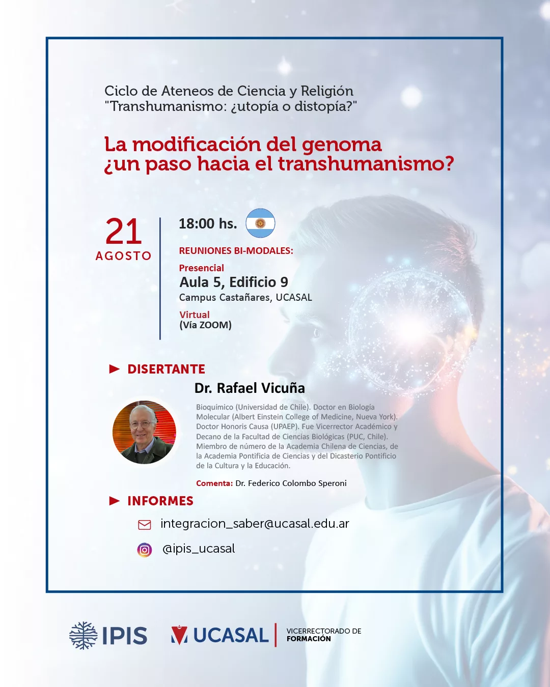 El miércoles 21 de agosto a las 18hs. disertará el Dr. Rafael Vicuña: “La modificación del genoma ¿un paso hacia el transhumanismo?”