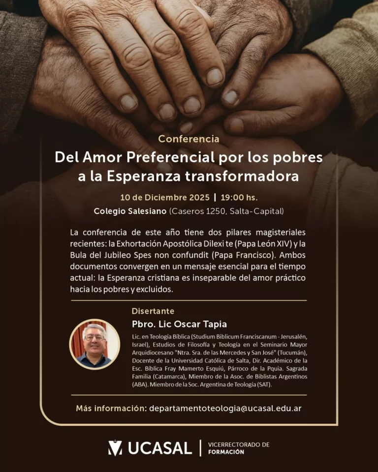 UCASAL invita a participar de la conferencia “Del Amor Preferencial por los pobres a la Esperanza transformadora”, un espacio de reflexión que propone enlazar dos hitos del magisterio reciente: la Exhortación Apostólica Diléxi te del Papa León XIV y la Bula del Jubileo Spes non confundit del Papa Francisco.