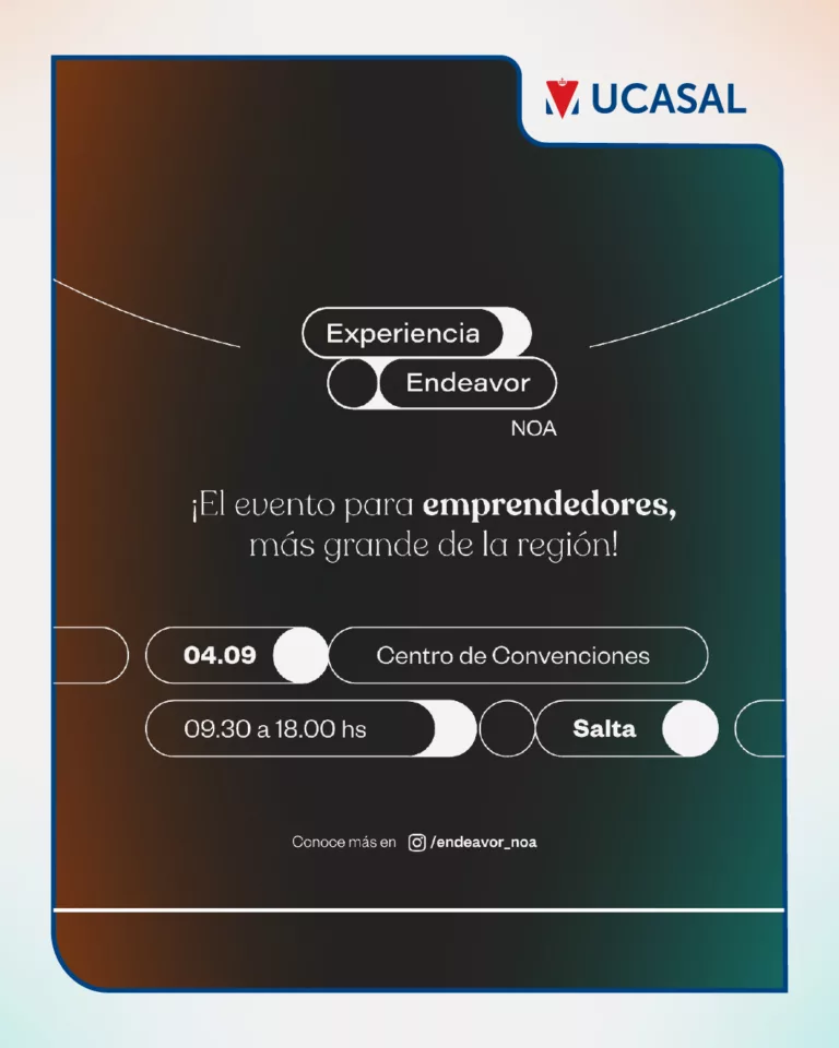 En línea con su compromiso con el desarrollo emprendedor y la formación de líderes con impacto, la Universidad Católica de Salta (UCASAL) participará activamente de una nueva edición de la Experiencia Endeavor NOA, que se llevará a cabo el 4 de septiembre en el Centro de Convenciones de Salta de 9.00 a 18.00 hs.