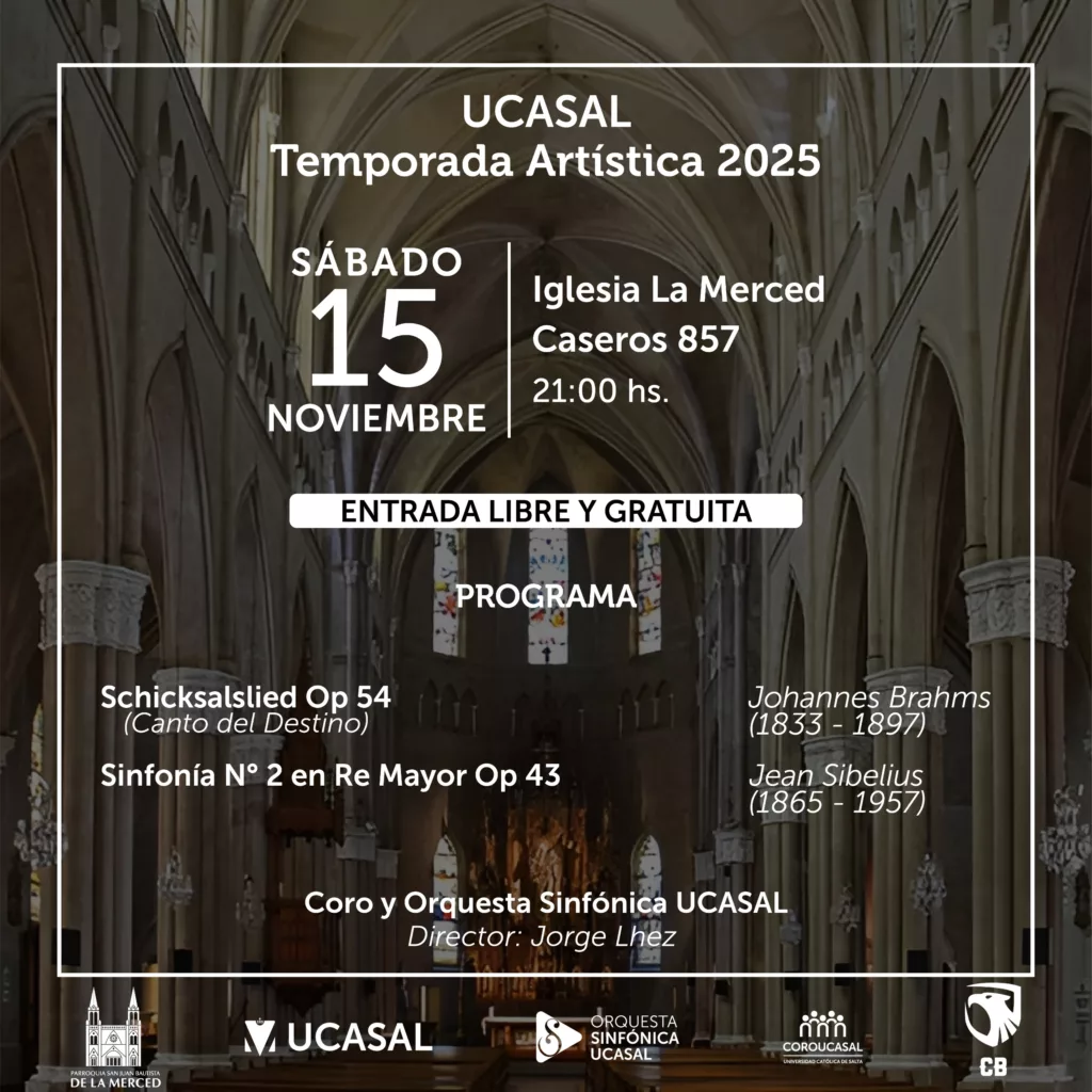 Un encuentro musical imperdible llegará este sábado 15 de noviembre a la Iglesia La Merced, donde el Coro y la Orquesta Sinfónica UCASAL ofrecerán un concierto abierto a toda la comunidad bajo la dirección del maestro Jorge Lhez.