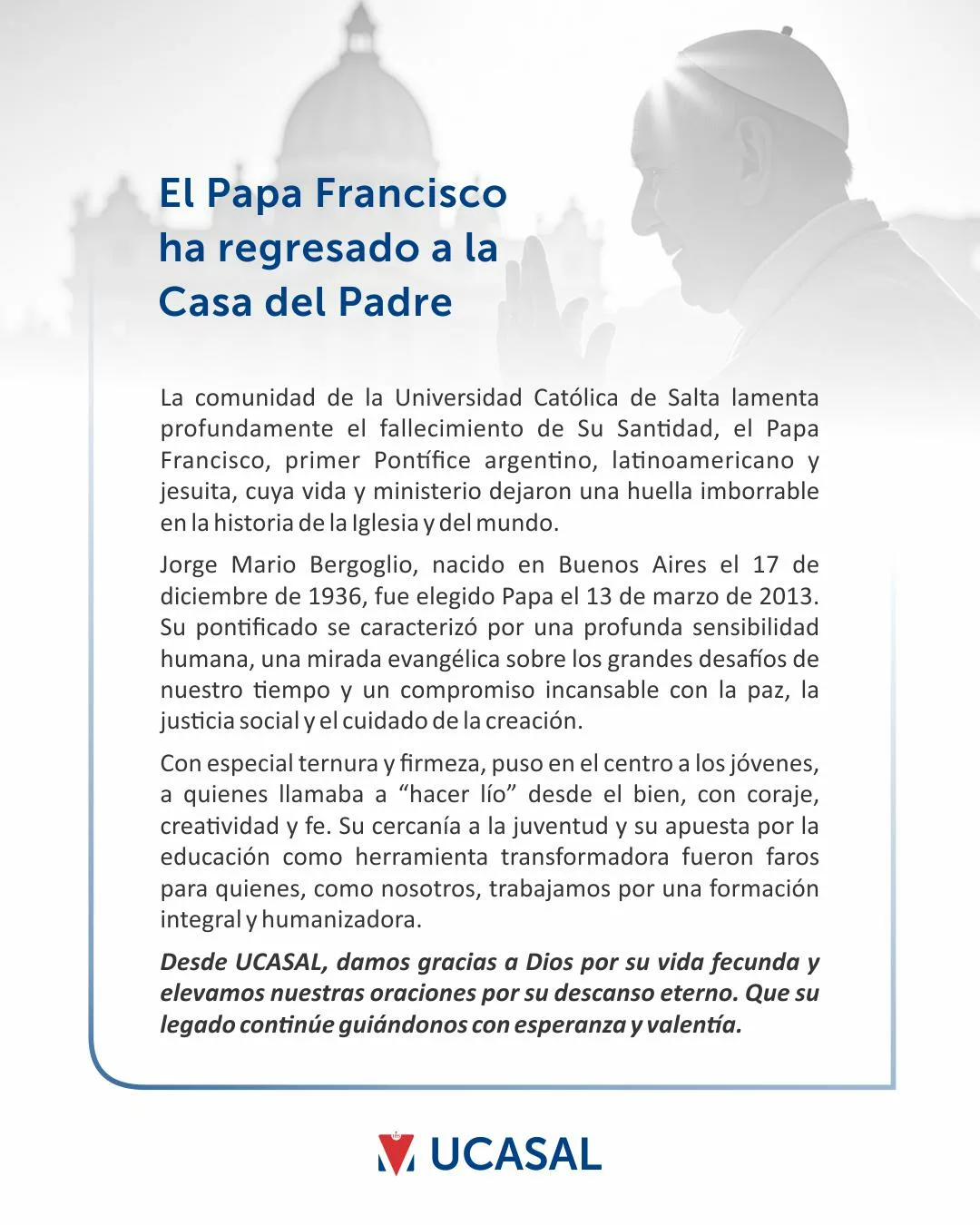 Desde UCASAL, damos gracias a Dios por su vida fecunda y elevamos nuestras oraciones por su descanso eterno. Que su legado continúe guiándonos con esperanza y valentía.