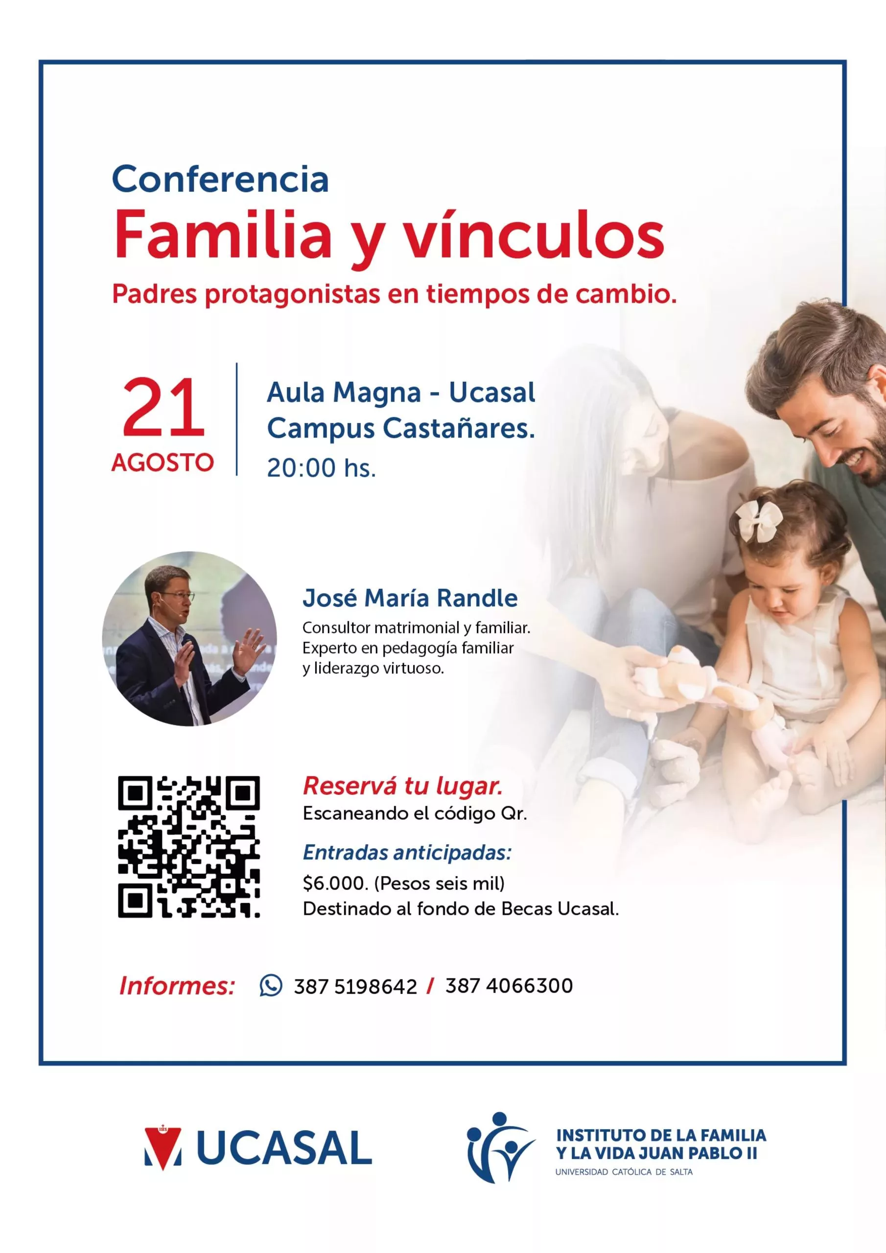Las temáticas familiares requieren de atención específica y un abordaje concreto. En este contexto, surge la Conferencia sobre Familia y Vínculos: “Padres protagonistas en tiempos de cambio”. Se dictará el próximo miércoles 21 de agosto, a las 20:00 hs. en el Aula Magna de UCASAL (Campo Castañares).