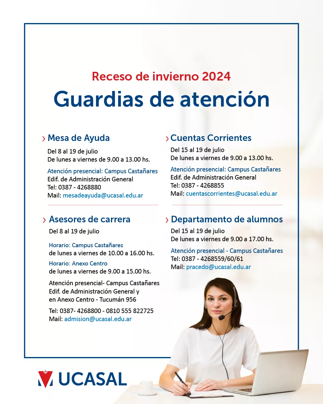 Les informamos que durante el receso de invierno 2024, las oficinas administrativas y de atención al público tendrán horarios de guardia especiales para asegurar que puedan resolver sus consultas y trámites urgentes.