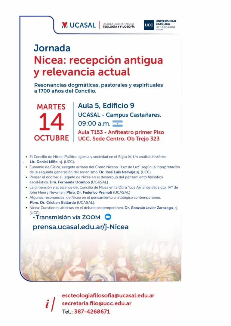 En el marco de los 1700 años del Concilio de Nicea, la Escuela Universitaria de Teología y Filosofía de UCASAL y la Facultad de Teología de la Universidad Católica de Córdoba, organizan la Jornada “Nicea: recepción antigua y relevancia actual”, que se llevará a cabo el próximo martes 14 de octubre a las 9:00 hs. en modalidad presencial en ambas sedes, con transmisión simultánea vía Zoom.