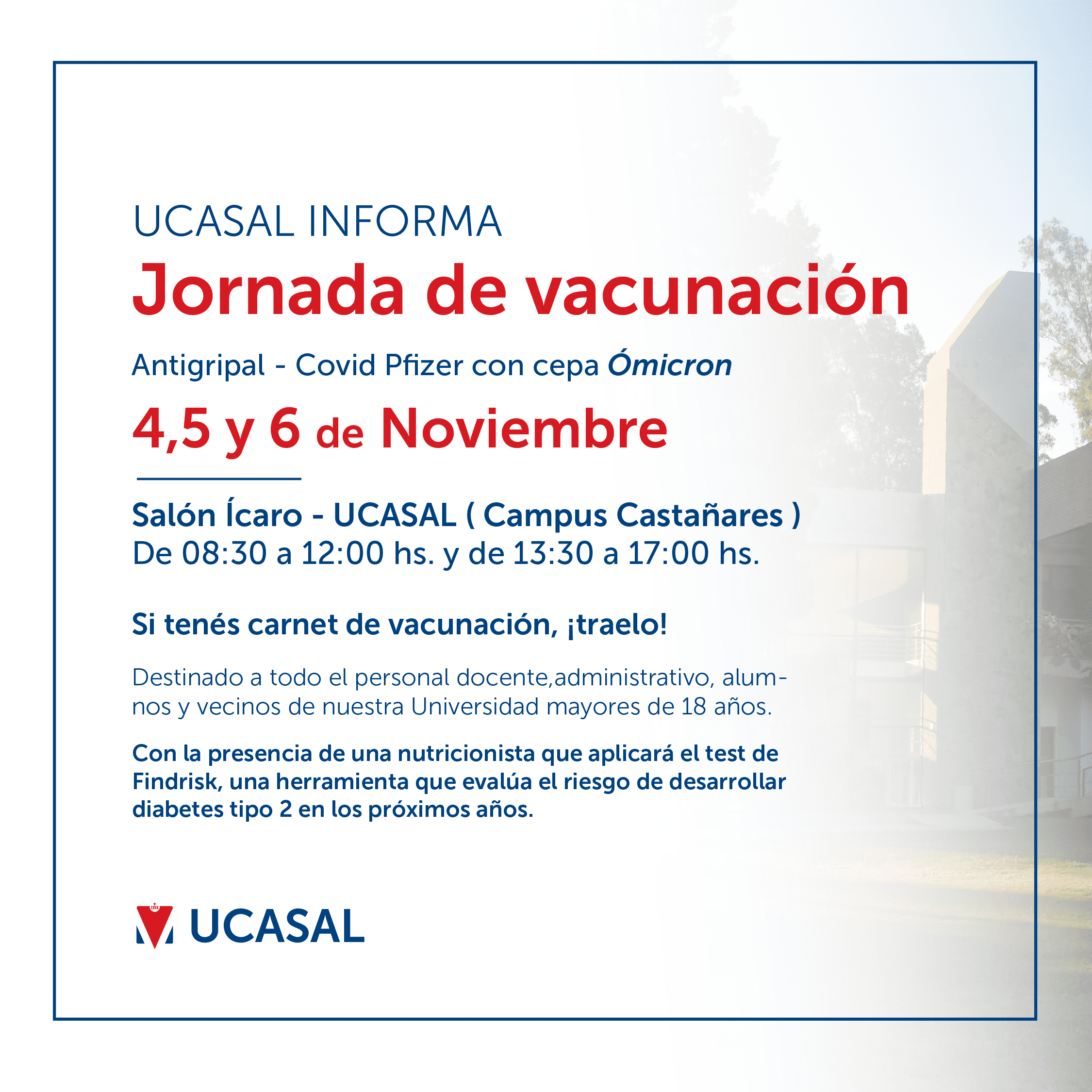El próximo 4, 5 y 6 de noviembre, la Universidad Católica de Salta realizará una jornada de vacunación antigripal en el Salón Ícaro de UCASAL, de 08:00 a 12:00 y de 13:30 a 17:00 horas.