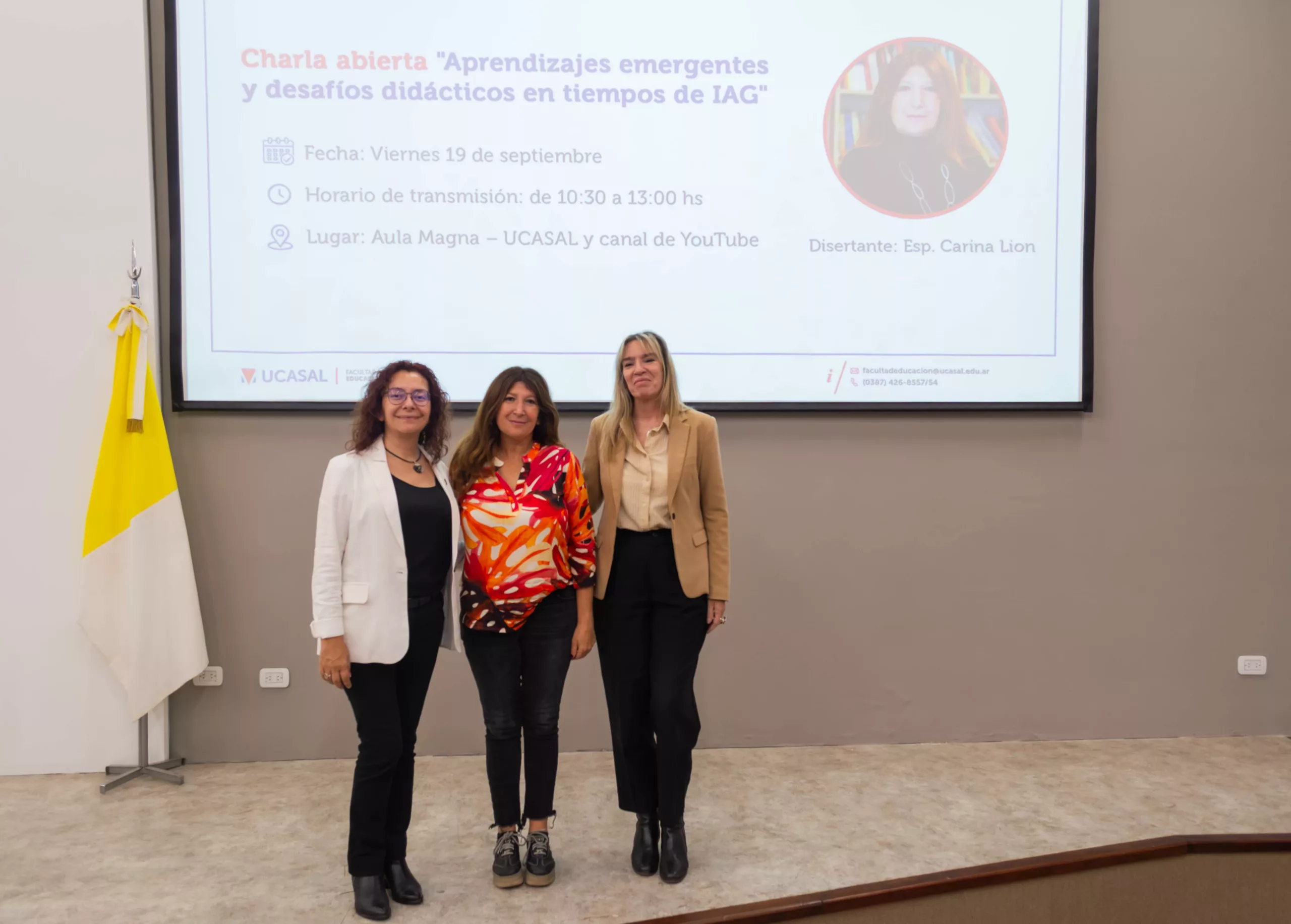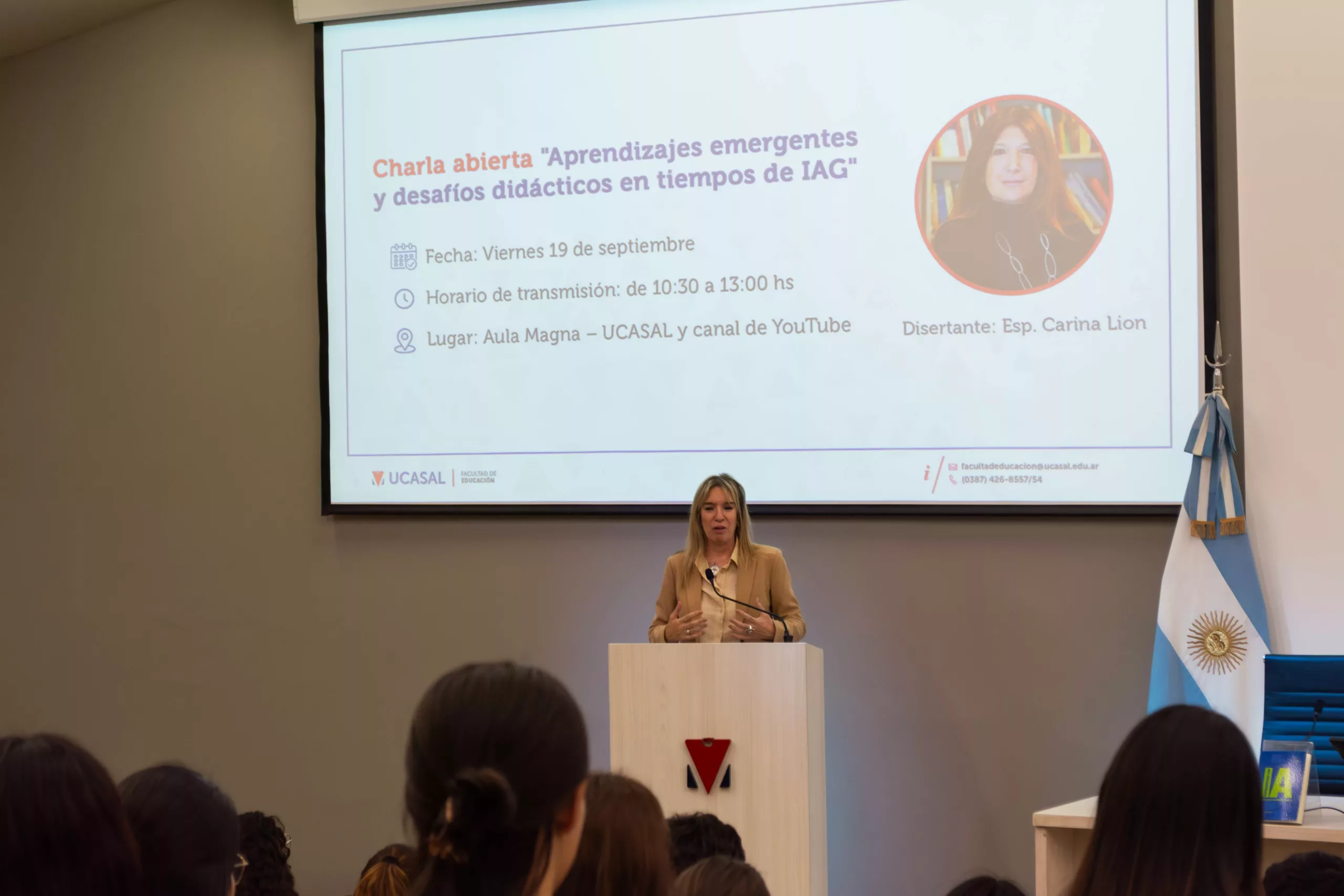 El foco estuvo puesto en la charla brindada por la Esp. Carina Lion, Doctora en Educación por la UBA, titulada “Aprendizajes emergentes y desafíos didácticos en tiempos de IAG”. En un contexto de cambios, la disertante remarcó que la inteligencia artificial puede ser una aliada clave en procesos de análisis de datos, escritura y edición, pero advirtió que “la pregunta de una investigación debe ser genuina, fértil y partir de un investigador; podemos formularla con IA, pero tiene que ser nuestra y potente”.