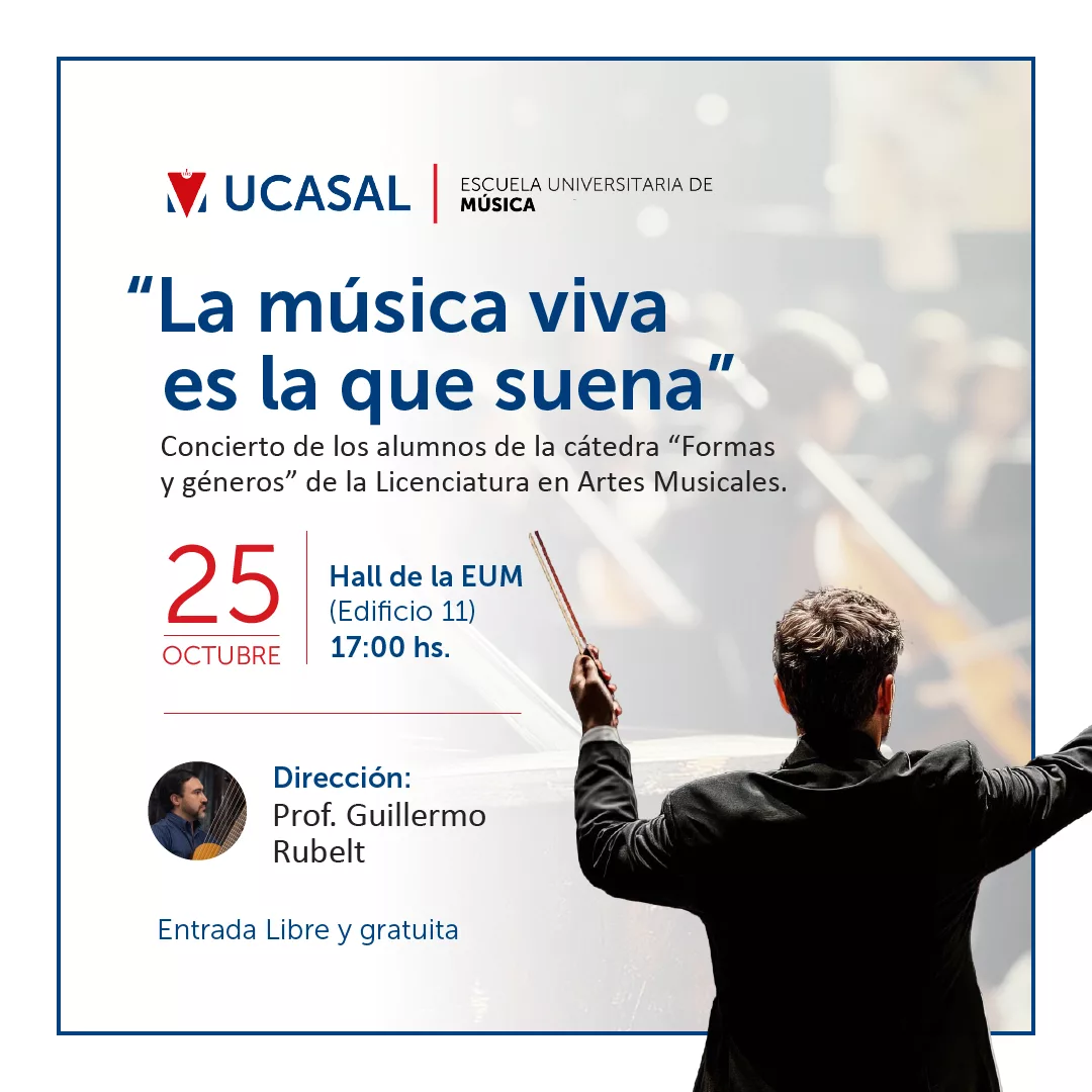 La Escuela Universitaria de Música de UCASAL invita a la comunidad a disfrutar de un concierto a cargo de los alumnos de la cátedra “Formas y géneros” de la Licenciatura en Artes Musicales. El evento se llevará a cabo el 25 de octubre a las 17:00 hs en el hall de la EUM (Edificio 11).