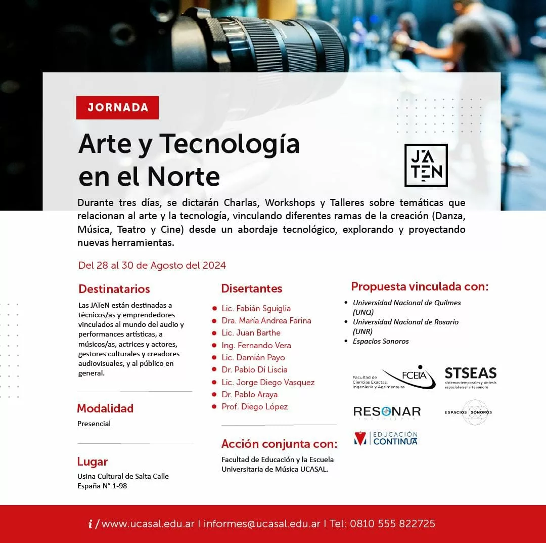 ¡El arte y la tecnología se encuentran! Conocé nuevas herramientas y perspectivas en danza, música, teatro y audiovisual a través de charlas abiertas y enriquecedoras. Esta edición contará con expertos de Salta, Buenos Aires y Santa Fe, abarcando temáticas desde composición musical hasta ingeniería en audio e imagen.