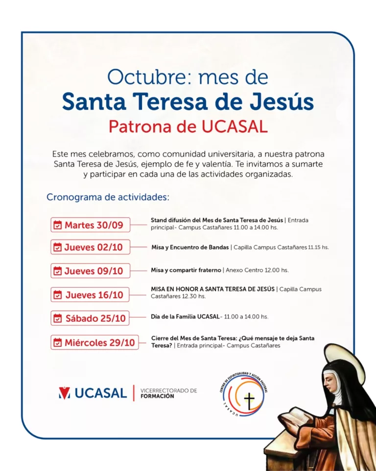 Con estas propuestas, UCASAL invita a toda la comunidad universitaria a vivir el Mes de Santa Teresa de Jesús como un tiempo de encuentro, celebración y renovación de la fe compartida.