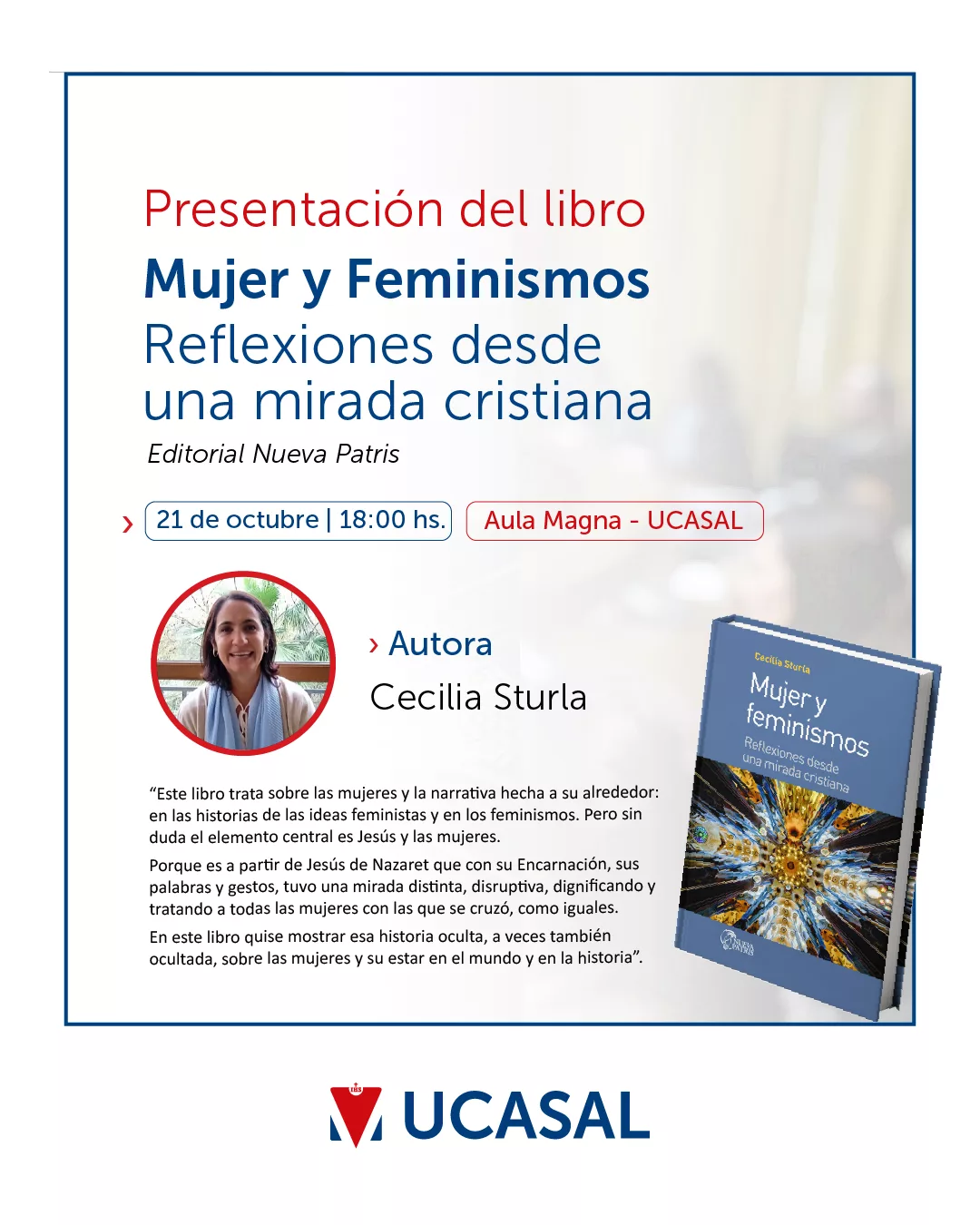 El próximo lunes 21 de octubre a las 18:00 hs. se llevará a cabo la presentación del libro “Mujer y Feminismos: Reflexiones desde una mirada cristiana”, escrito por Cecilia Sturla. El evento se realizará en el Aula Magna de la Universidad Católica de Salta (UCASAL).