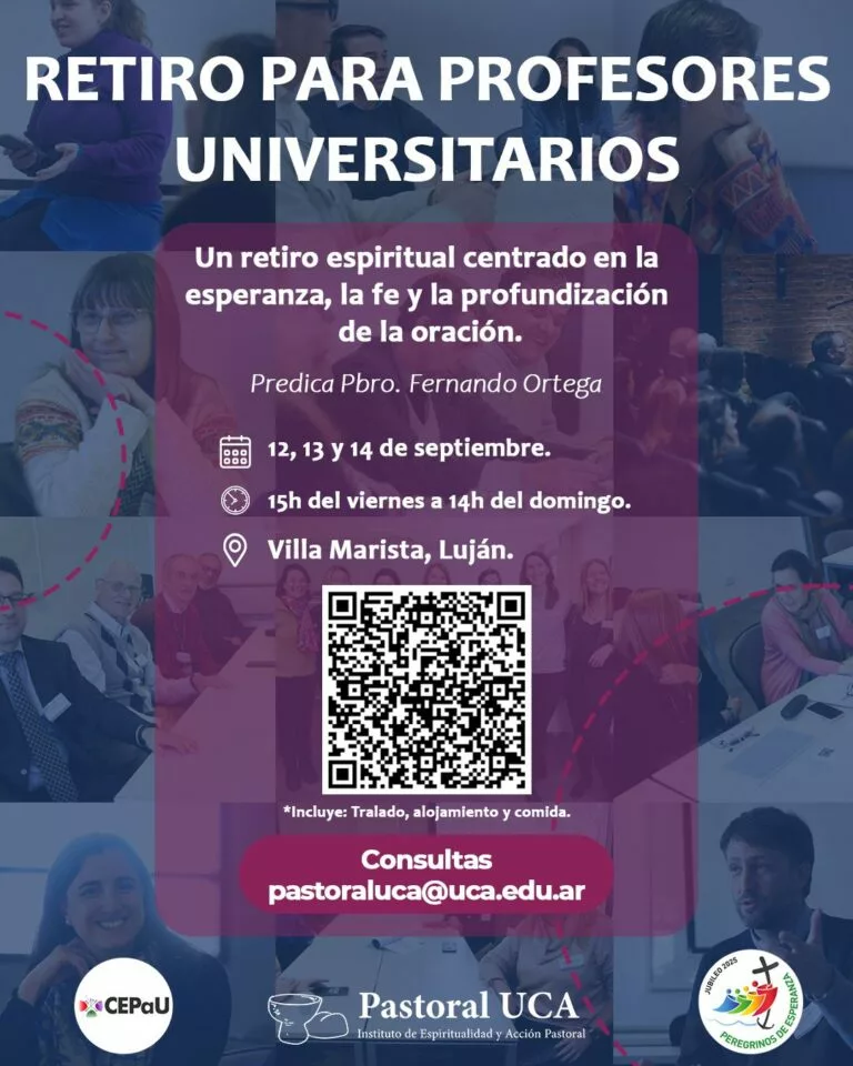 El Instituto de Espiritualidad y Acción Social de la Pastoral UCA, junto a la Comisión Episcopal de Pastoral Universitaria (CEPAU) invitan a participar del Retiro para Profesores Universitarios, una experiencia de encuentro y reflexión centrada en la esperanza, la fe y la profundización de la oración.