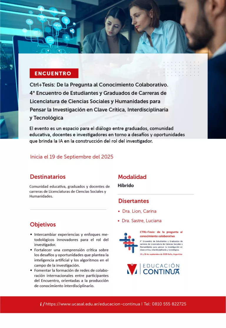La Universidad Católica de Salta invita a participar del 4° Encuentro de Estudiantes y Graduados de Carreras de Licenciatura de Ciencias Sociales y Humanidades, titulado “Ctrl+Tesis: De la Pregunta al Conocimiento Colaborativo”, que se llevará a cabo desde el 19 de septiembre de 2025, en modalidad híbrida.