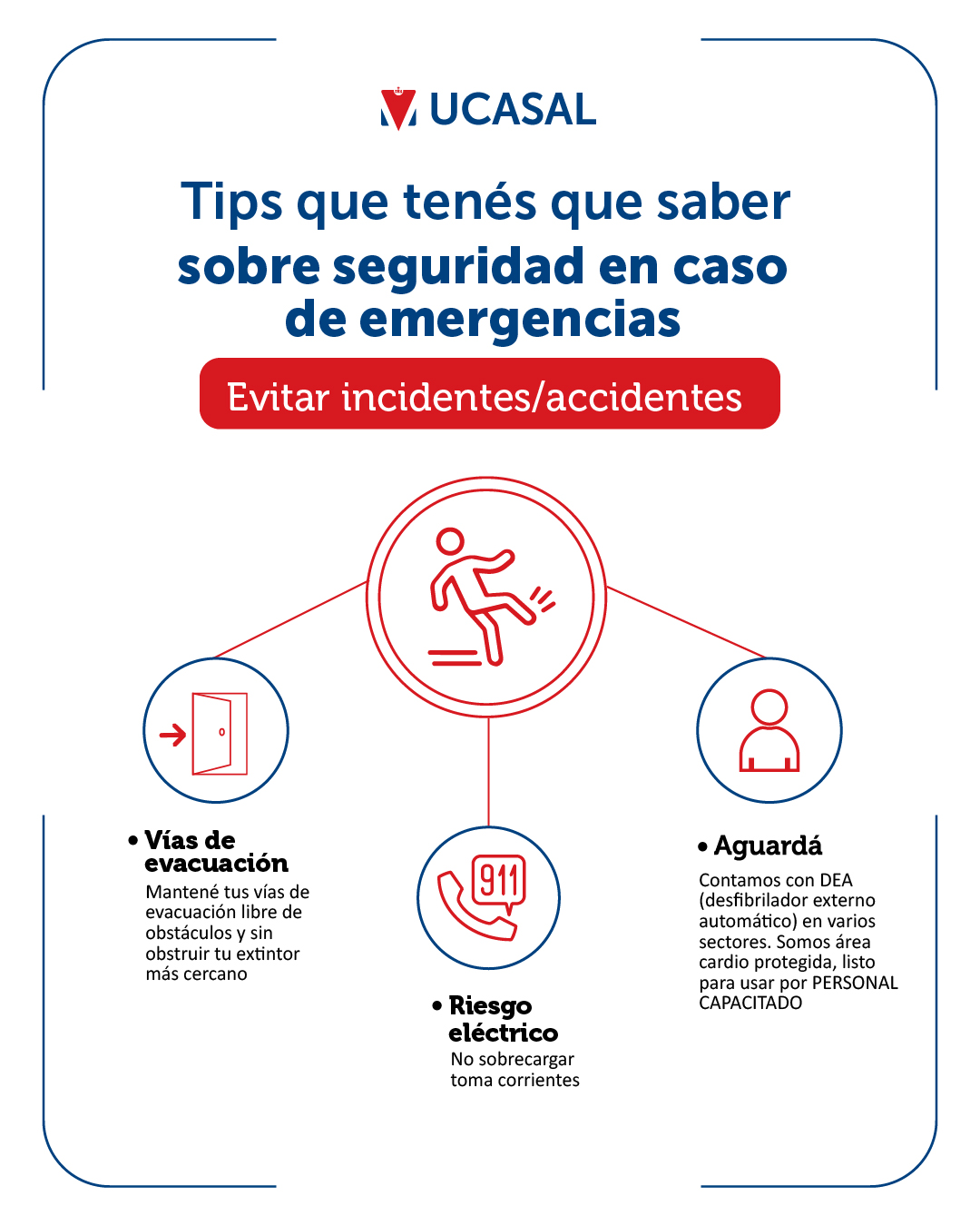 Seguimos trabajando para garantizar la seguridad de nuestra comunidad, por eso, te compartimos nuevas recomendaciones en caso de accidentes o incidentes en UCASAL.