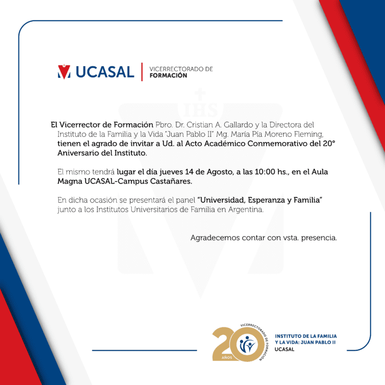 La Universidad Católica de Salta invita a toda la comunidad a participar de las actividades conmemorativas por el 20° Aniversario del Instituto de la Familia y la Vida “Juan Pablo II”, que se llevarán a cabo el próximo jueves 14 de agosto en el Campus Castañares y en el Seminario Metropolitano de Salta.