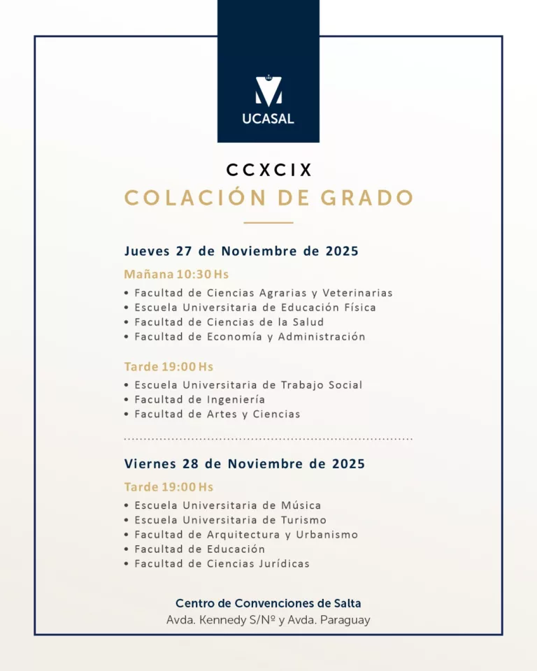La Universidad Católica de Salta se prepara para vivir uno de los momentos más esperados del año académico: el Acto de Colación de Grado y Pregrado CCXCIX, que tendrá lugar los días jueves 27 y viernes 28 de noviembre en el Centro de Convenciones de Salta.