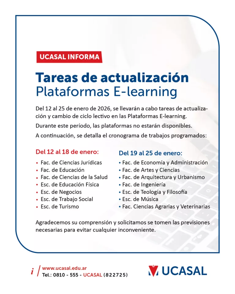 Del 12 al 25 de enero de 2026, se realizarán tareas de actualización y cambio de ciclo lectivo en las plataformas E-learning institucionales.