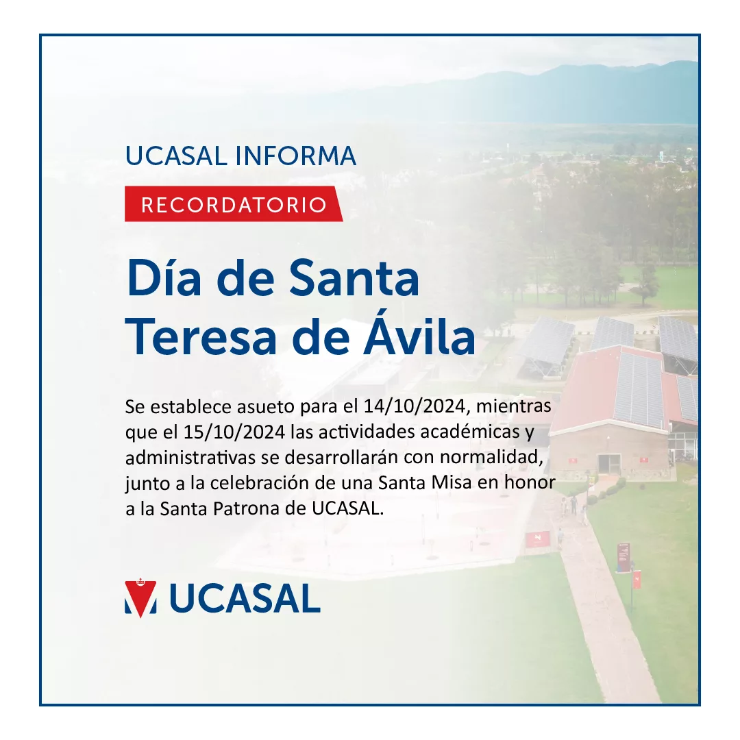 Se establece asueto para el 14/10/2024, mientras que el 15/10/2024 las actividades académicas y administrativas se desarrollarán con normalidad, junto a la celebración de una Santa Misa en honor a la Santa Patrona de UCASAL.