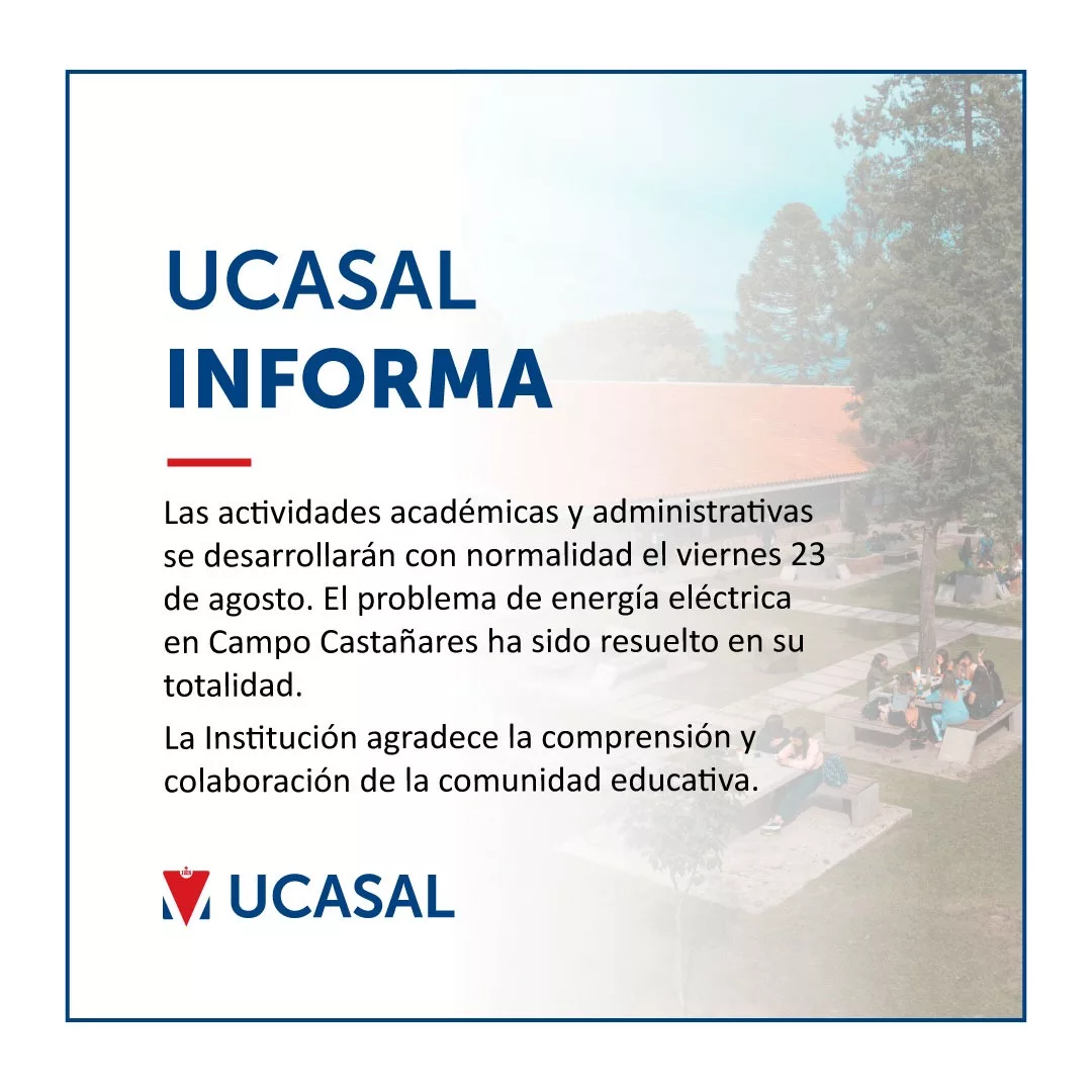 UCASAL INFORMA: Las actividades académicas y administrativas se desarrollarán con normalidad el viernes 23 de agosto