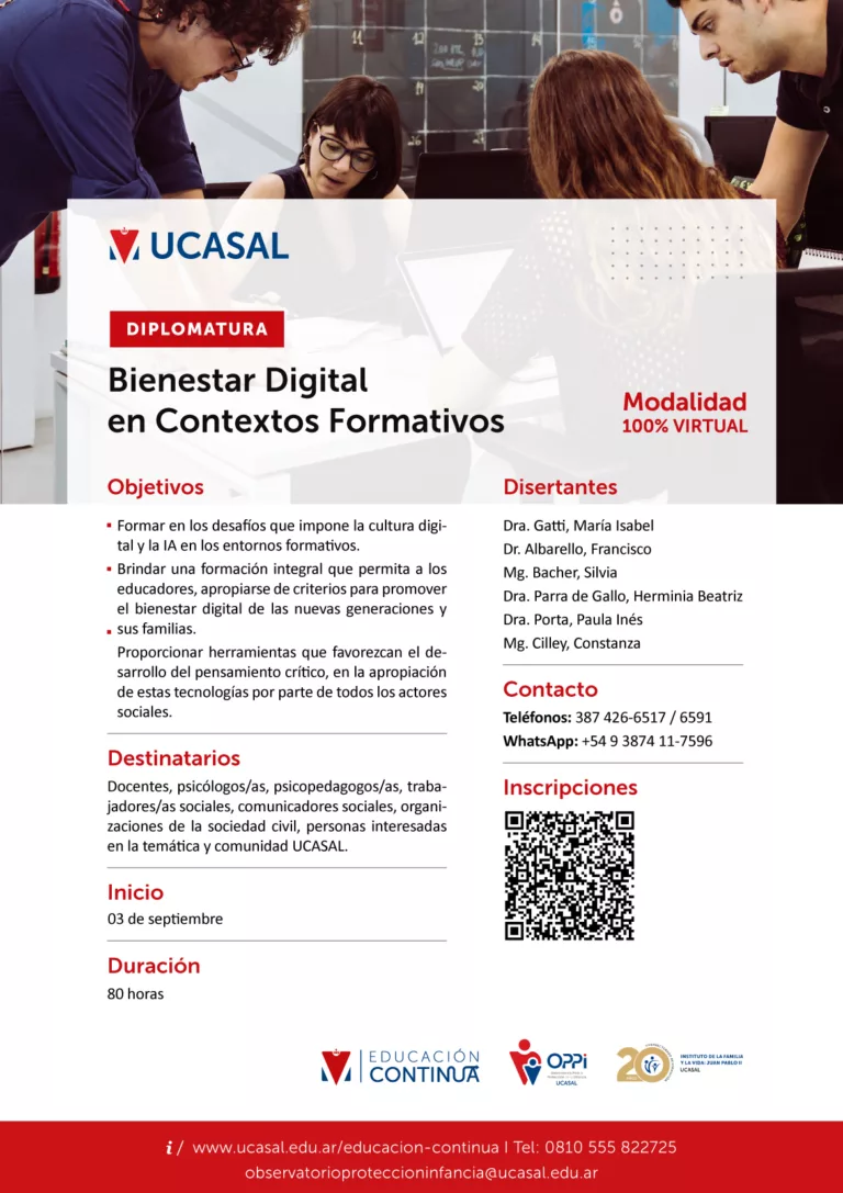 Con este propósito, la Universidad Católica de Salta (UCASAL) presenta la Diplomatura en Bienestar Digital en Contextos Formativos, un espacio académico diseñado para brindar herramientas que permitan comprender y gestionar los desafíos de la cultura digital.