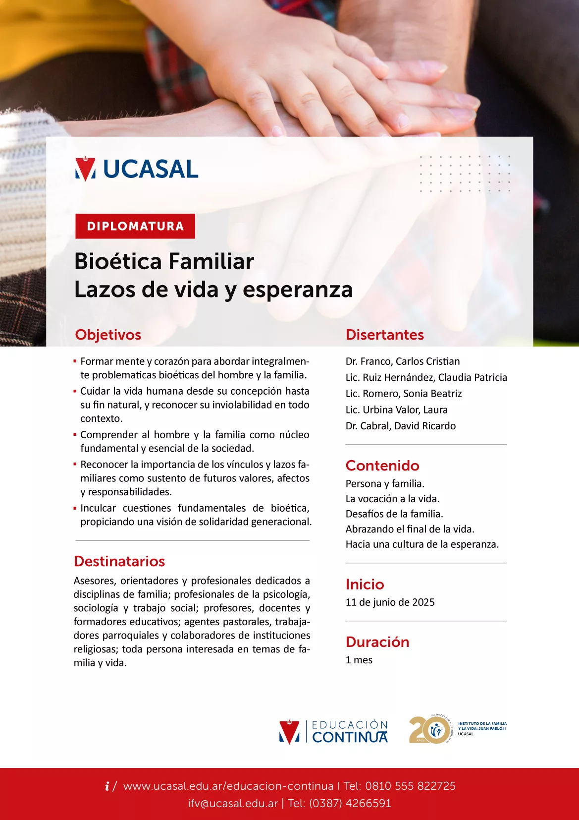 La Directora del Instituto de la Familia y la Vida “Juan Pablo II”, Mg. María Pía Moreno Fleming, destaca que “la familia es esencial para educar sobre la vida y los valores que fundamentan su respeto y dignidad. Esta iniciativa académica desarrolla contenidos sustantivos relativos al misterio del corazón humano en relación con la tutela de la persona a lo largo de todo el ciclo vital familiar”.