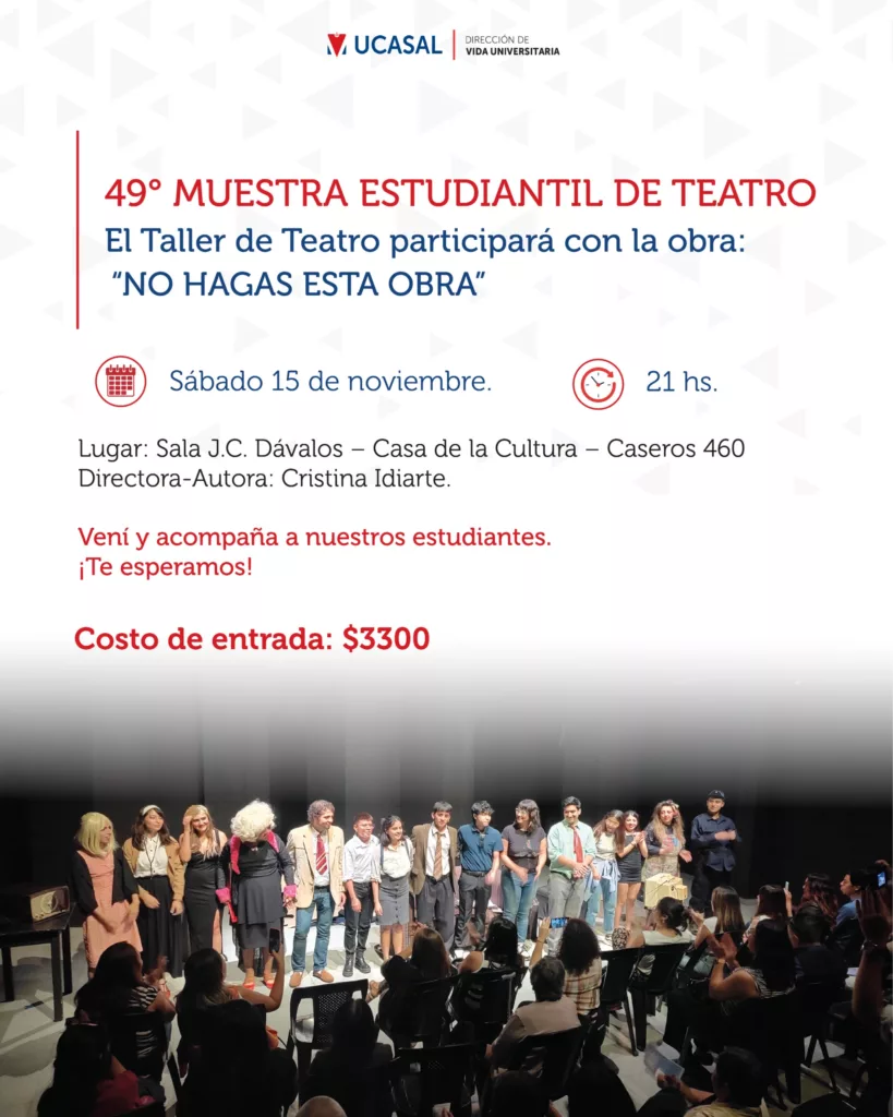 La Universidad participará en la 48ª Muestra Estudiantil de Teatro, organizada por la Universidad Nacional de Salta. En esta edición, los estudiantes del Taller “¡Viví Teatro!” se presentarán por segundo año consecutivo interpretando “No hagas esta obra”, dirigida por la profesora Cristina Idiarte.