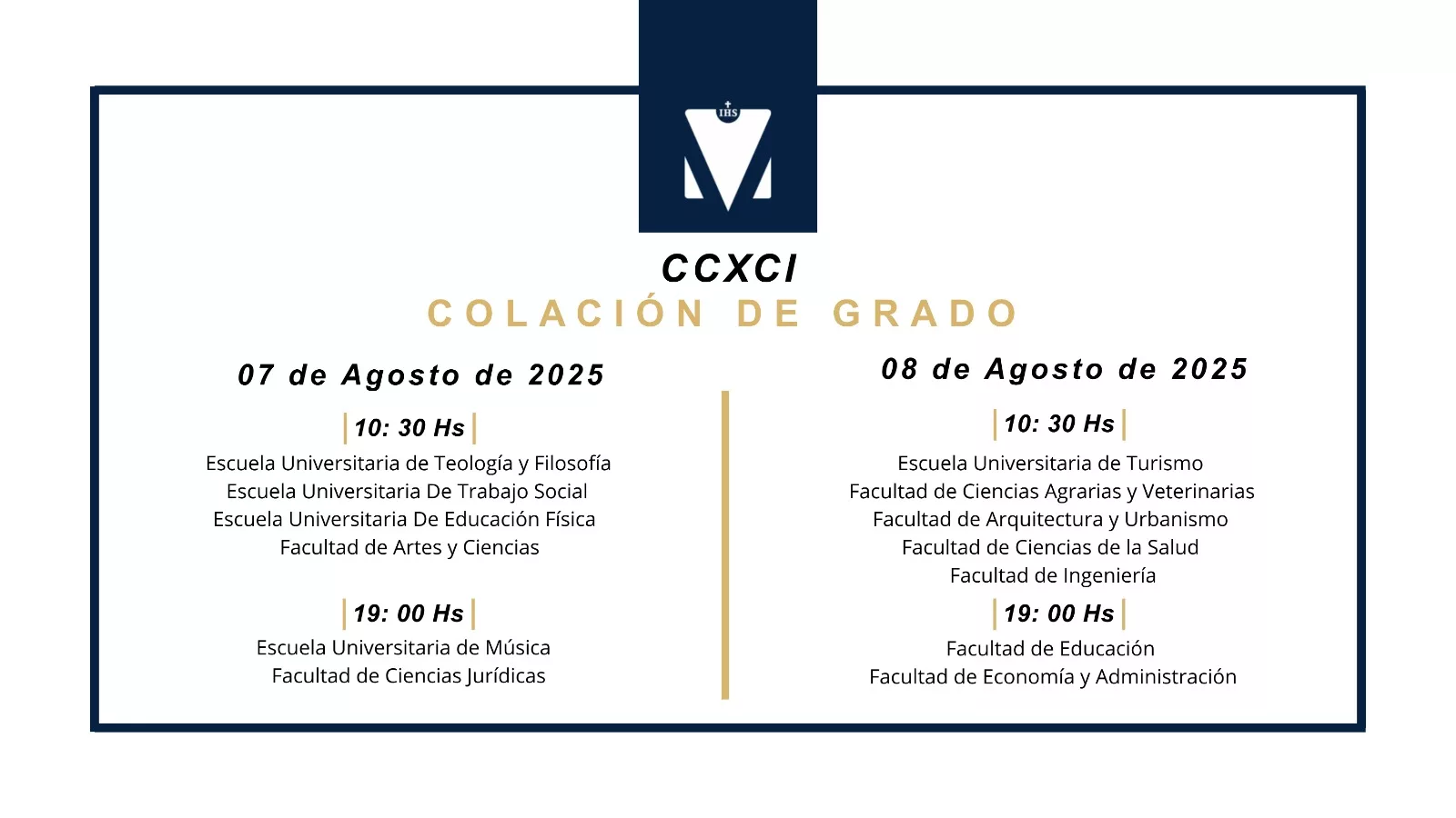 Las ceremonias se realizarán en doble horario, a las 10.30 h por la mañana y a las 19 h por la tarde, y reunirán a egresados de diversas carreras que culminan una importante etapa de su formación académica.