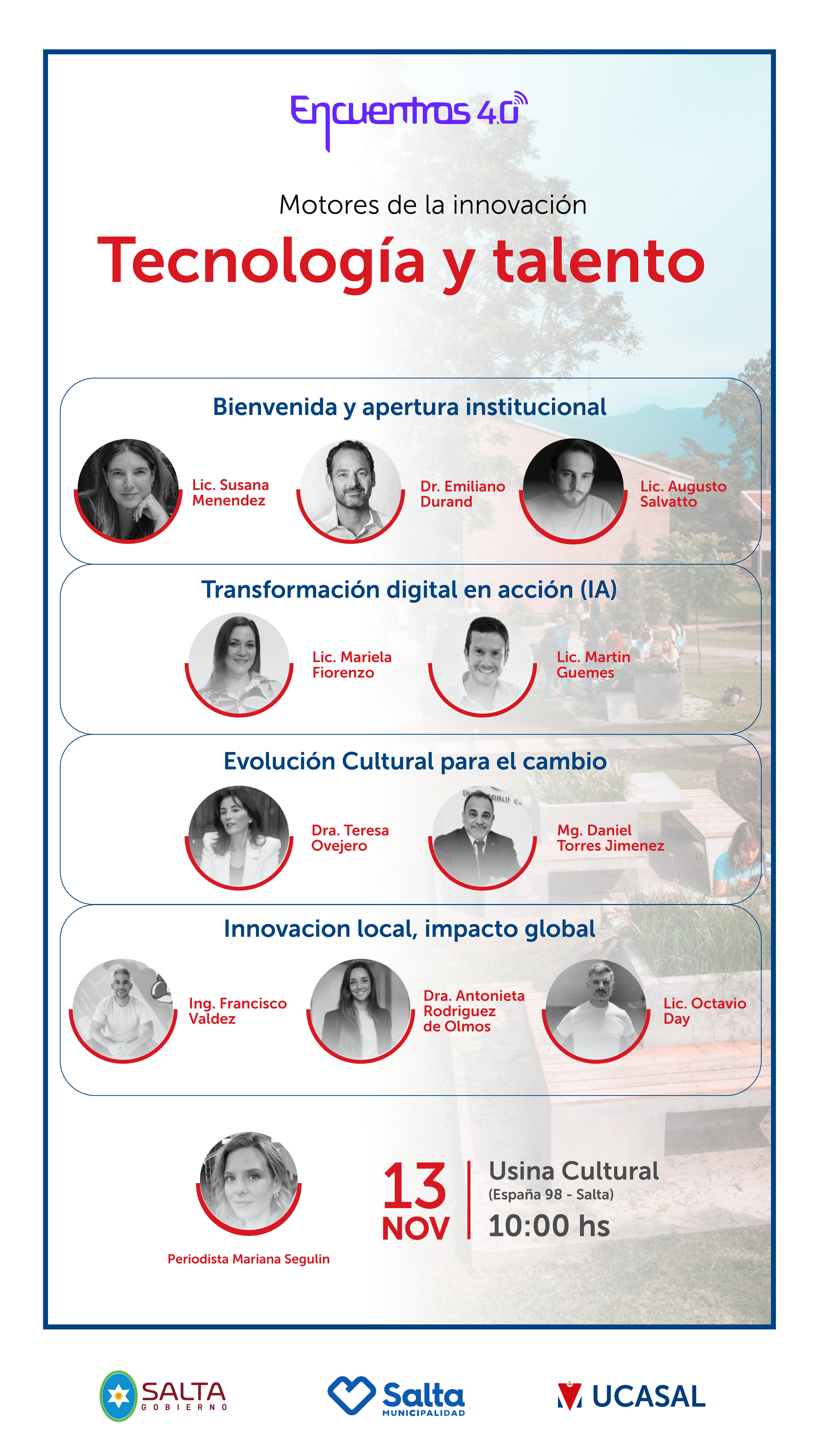 El encuentro que propone Telecom promueve una visión multidisciplinaria en torno a la incorporación de las tecnologías en la vida cotidiana y profesional. En esta edición en Salta, expertos del sector público y privado, así como líderes académicos, debatirán sobre la evolución del talento y la innovación en diversos ámbitos, desde la justicia hasta la modernización estatal y el mundo emprendedor. En esta oportunidad, UCASAL estará representada por su Vicerrector de Tecnología y Educación Digital, Daniel Torres Jiménez, quien junto a Teresa Ovejero, Presidenta de la Corte de Justicia de Salta, abordará el tema “Evolución Cultural para el Cambio” y su impacto en las instituciones.