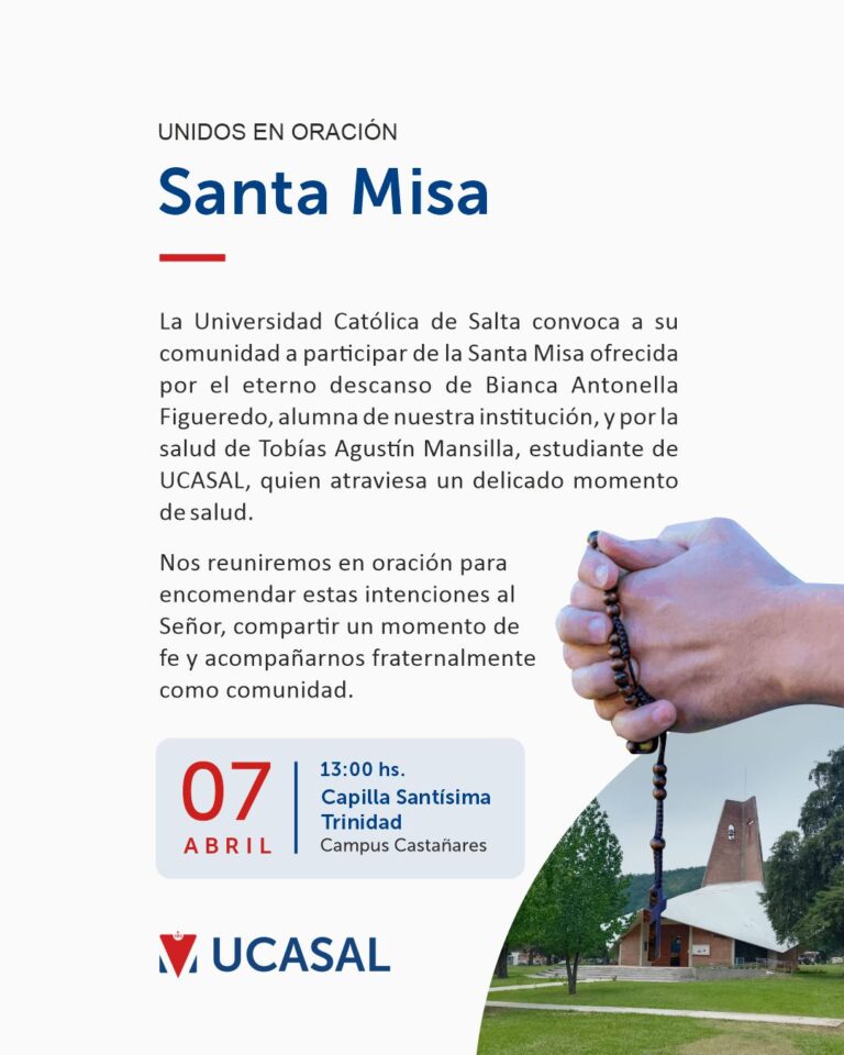 La Universidad Católica de Salta invita a participar de la Santa Misa que se celebrará por el eterno descanso de Bianca Antonella Figueredo, alumna de nuestra institución, y por la salud de Tobías Agustín Mansilla, estudiante de UCASAL.
