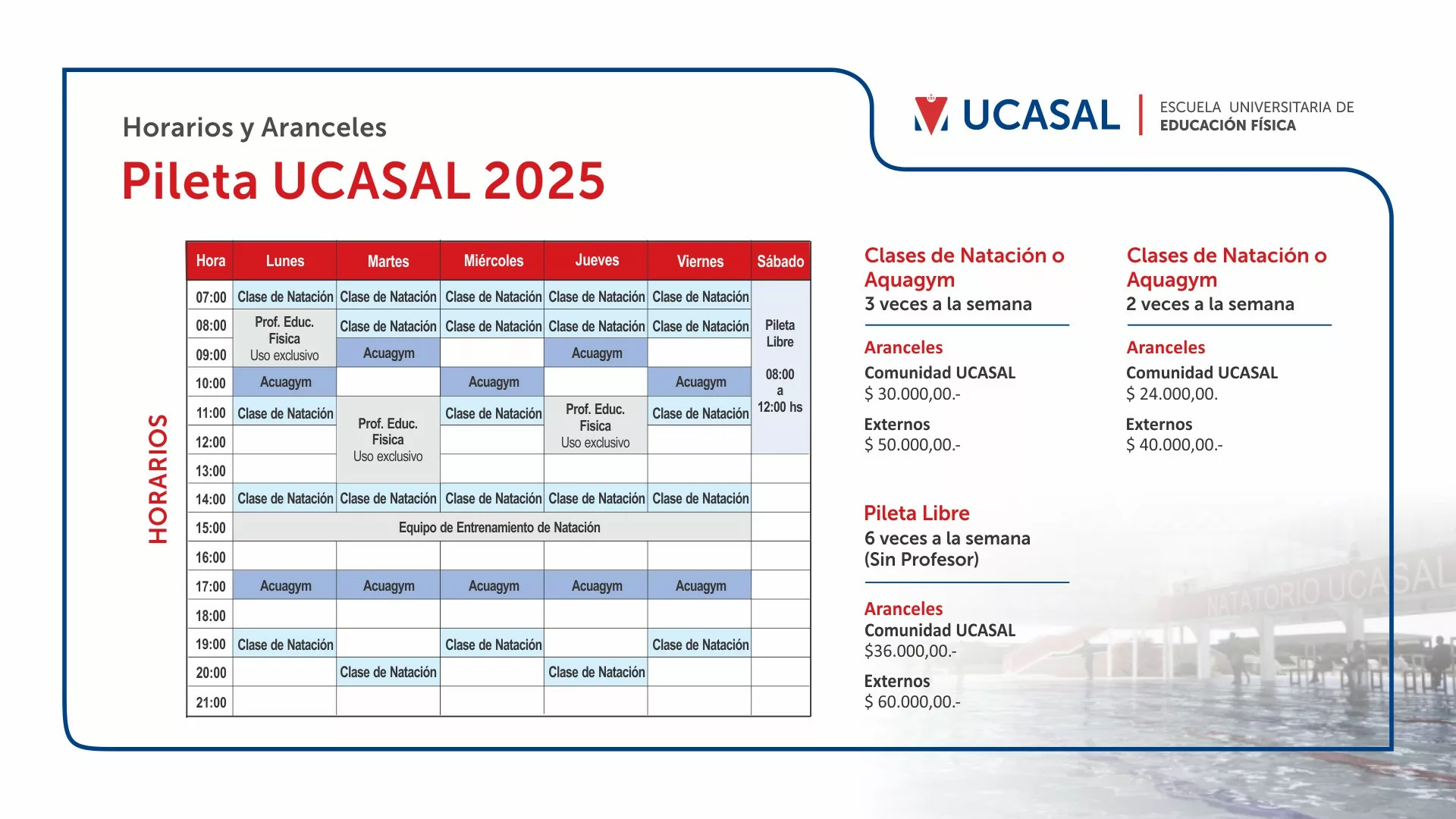 Conocé los horarios disponibles y los aranceles vigentes para hacer uso de la pileta climatizada de UCASAL. Un espacio ideal para ejercitarte, relajarte y cuidar tu salud durante todo el año 😊