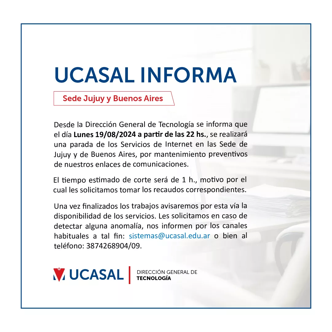Desde la Dirección General de Tecnología se informa que el día lunes 19/08/2024 a partir de las 22 hs., se realizará una parada de los Servicios de Internet en la Sede de Jujuy y de Buenos Aires, por mantenimiento preventivo de nuestros enlaces de comunicaciones.