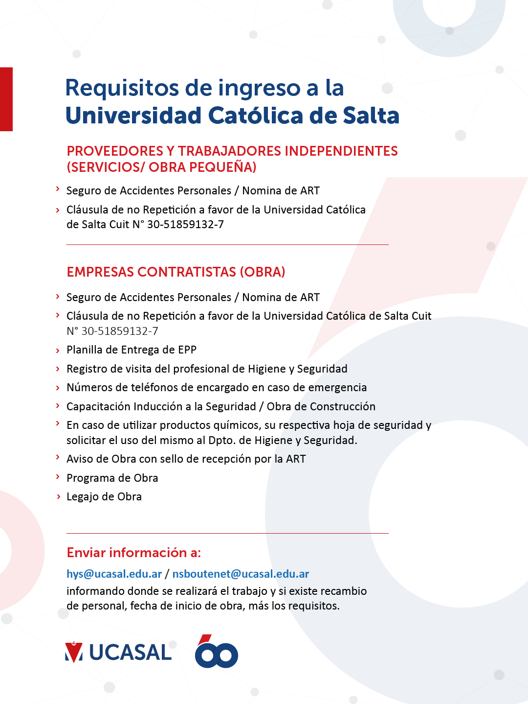 Conocé los requisitos para que Proveedores, Trabajadores Independientes y Empresas Contratistas ingresen a UCASAL.